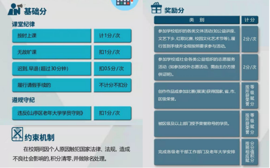 明细积分内容,量化考核标准。关注老年学员特点和需求,制定《山亭区老年大学学员积分管理办法(试行)》,按照易懂、方便操作的原则,设定基础分、奖励分和反向约束三个部分,积分管理办法以正向激励为主,细化了加分项、扣分项,奖励分不设上限,主要为了提高老年学员参加各类社会活动、志愿服务、文艺展演的热情。同时设立反向约束机制,给学员设置“红线”,建立了让老年学员“看得到、算得清、摸得着”的量化指标体系,实现了以基础分“促学”,用奖励分“提高”,借扣分“提醒”,有效推动学员自我监督、自我完善、自我发展。