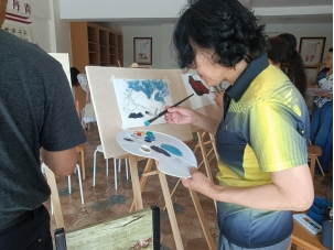 课上,钱老师现场演示国画绘画过程中的技巧,并带领参与活动的居民朋友们进行练习,讲解颜料的调色,并通过色彩的浓淡变化来突出花的特色,对整个画面的结构处理做了的极其细致的讲解。在钱老师的指导下,居民们的作品初见雏形,墨笔生花,一朵朵美丽的花儿或浓或淡地跃然纸上。学员的兴奋之情溢于言表,他们说:“在家门口也能听到这么专业、这么高水准的国画课,真的受益匪浅!”