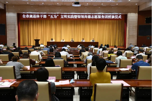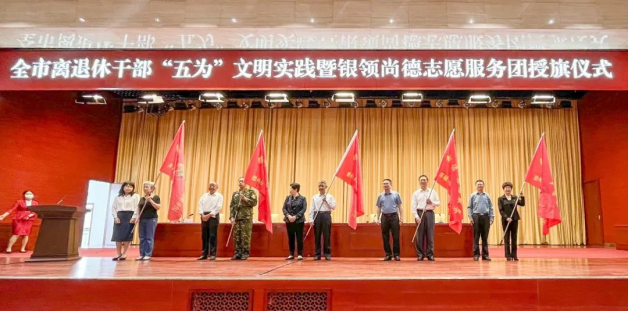 为深入学习贯彻党的二十大精神,认真落实省、市关于开展“五为”文明实践志愿服务要求,深化推进全市离退休干部志愿服务工作,推动老干部工作高质量发展,5月24日,德州市举行“贯彻党的二十大·银领暖州城”离退休干部“五为”文明实践暨“银领尚德”志愿服务团授旗仪式,集中为各县市区、市直部门、市县老年大学、市县关工委“银领尚德”离退休干部志愿服务团(队)授旗。