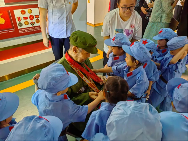 “爷爷,你的手指被弹片划伤的时候一定很疼吧!”“当时战斗打得很激烈,顾不上细看,但现在手指很难伸直啰!”身着军服、胸前佩戴着8枚勋章、95岁高龄的老战士郭金刚爷爷与91岁的西南服务团老战士聂淑芬和大家互动讲述行军故事、战斗经历,同学们被深深吸引了,纷纷向老战士竖起了大拇指,并献上鲜花和自己绘制的贺卡表达对革命前辈的深深敬意。看着一张张阳光可爱充满朝气的笑脸,两位老前辈也是非常开心,勉励同学们要好好学习,争做新时代好少年,将来成为建设祖国的栋梁。