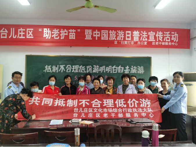 为提高老年人的识骗意识和防骗能力,5月18日,枣庄台儿庄区老干部服务中心(老年大学)联合区文化市场综合行政执法大队开展“助老护苗”暨中国旅游日普法宣传活动,100余名老干部参加。