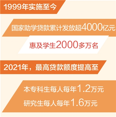 贷款额度不断提高。政策实施初期,全日制普通本专科生、研究生最高贷款额度每人每年6000元;2014年,提高至本专科生最高贷款额度每人每年8000元、研究生每人每年1.2万元;2021年,提高至本专科生最高贷款额度每人每年1.2万元、研究生每人每年1.6万元。