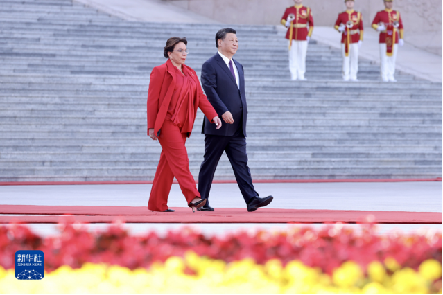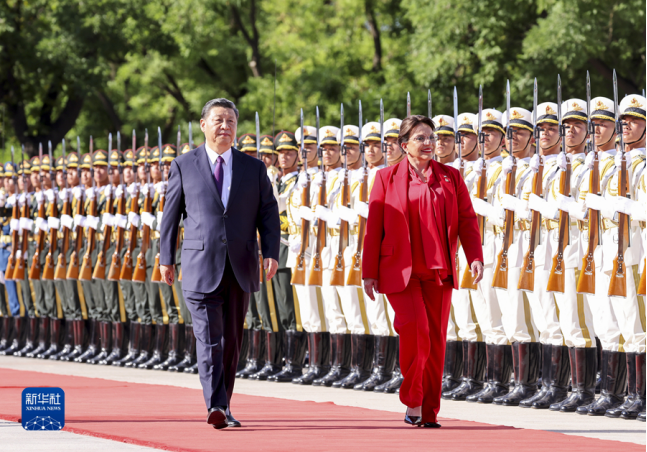 6月12日下午,国家主席习近平在北京人民大会堂同来华进行国事访问的洪都拉斯总统卡斯特罗举行会谈。这是会谈前,习近平在人民大会堂东门外广场为卡斯特罗举行欢迎仪式。新华社记者 黄敬文 摄