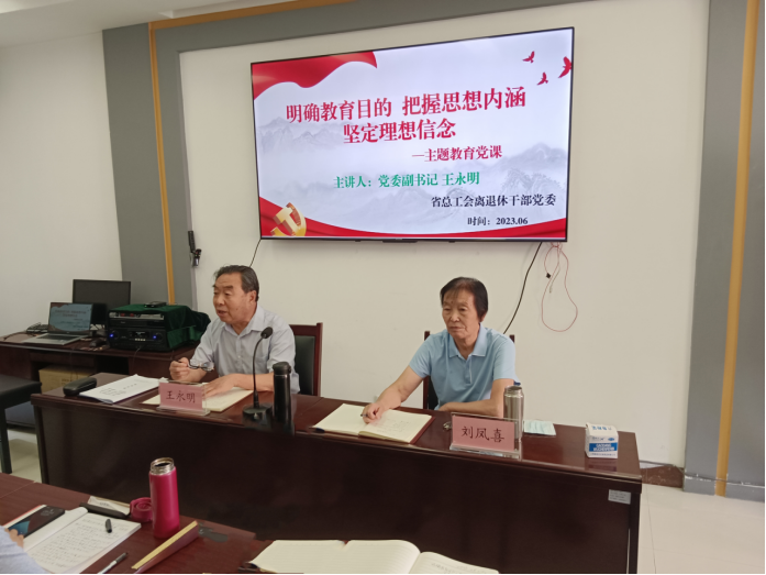 为深入推进学习贯彻习近平新时代中国特色社会主义思想主题教育,根据省总工会离退休干部党委2023年主题教育学习计划,6月14日,山东省总工会机关离退休干部党委副书记王永明在金源山居老干部活动中心讲授主题教育专题党课,离退休干部党委书记刘凤喜主持活动,60多位老党员干部聆听党课。