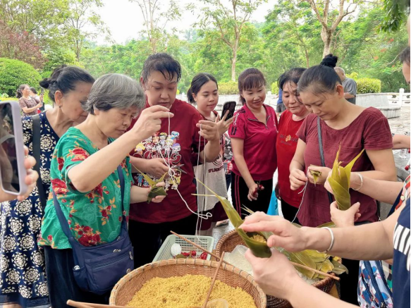 “米要放少一点,不然叶子裹不过来就会漏米了。”“是这样吗?我太笨了,老都老了,还没有学会包粽子。”伴随着阵阵欢笑声,大家在包粽子的“工位”上忙碌开来。既然是端午,粽子自然是不能少的,看着渐渐成型的粽子,满头大汗的大妈们露出了喜悦的笑容。