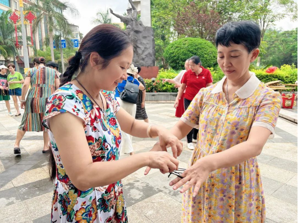 编花绳这边,部分大妈忙着包粽子,一些大妈已经拿起了花绳,忘我地玩了起来,手指在花绳间不断变换着位置。跳皮筋那边,皮筋在大妈的跳跃下晃动着,现场其乐融融。