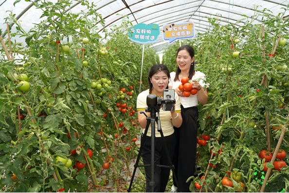 2023年6月4日,浙江温州,乐清市虹桥镇长山村,“农创客”在西红柿种植大棚进行“乐农好物·供销优选”直播推介。