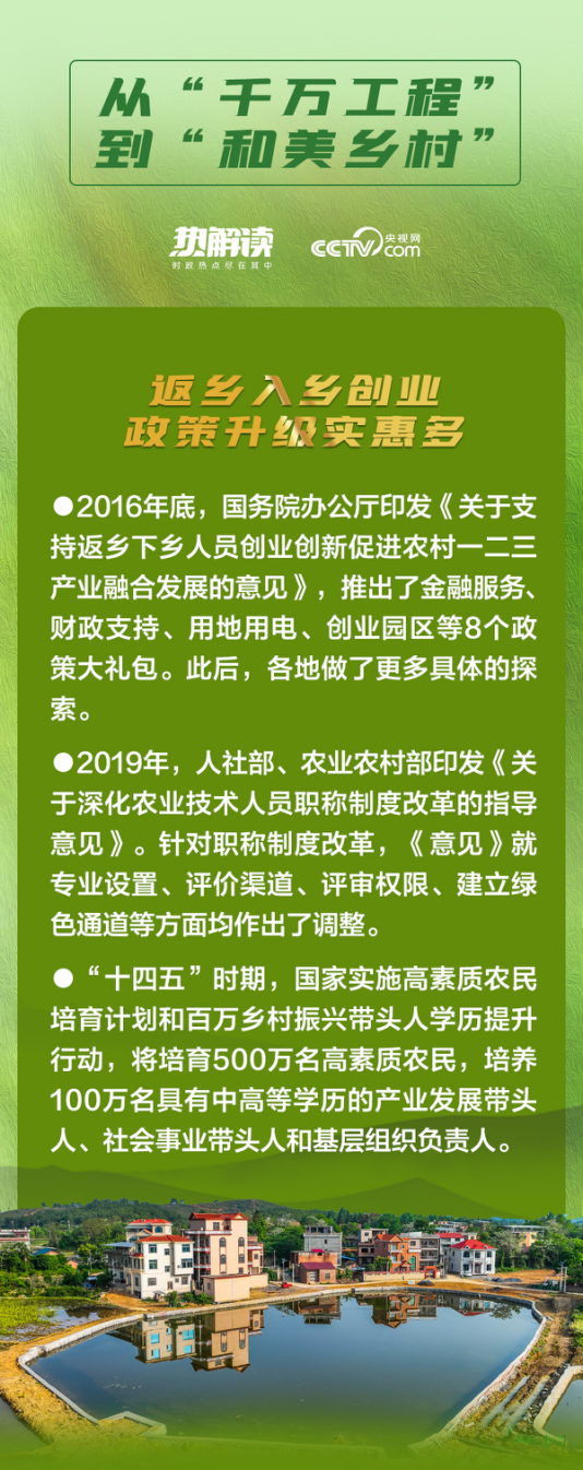 这些年,各地支持“新农人”返乡创业的政策不断出台,让愿意留在乡村、建设家乡的人留得安心,让愿意上山下乡、回报乡村的人更有信心,激励各类人才在农村广阔天地大施所能、大展才华、大显身手。
