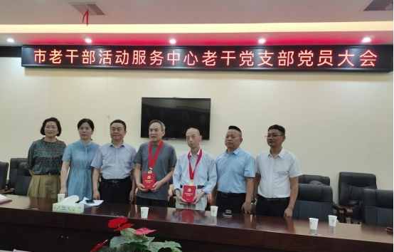 在中国共产党建党102周年纪念日到来之际,6月28日,湖南省岳阳市老干部活动服务中心离退休干部党支部举行庆“七一”暨老干部学习活动座谈会,并为党龄50年以上的老党员颁发“光荣在党50年”纪念章。市委组织部副部长、老干部局局长、离退休干部工委书记彭岳武,市委老干部局副局长赵奇志,市委老干部局副局长韩英,局务会成员周兰、宋仲斌,以及14名老党员等共25人欢聚一堂,向党献礼。
