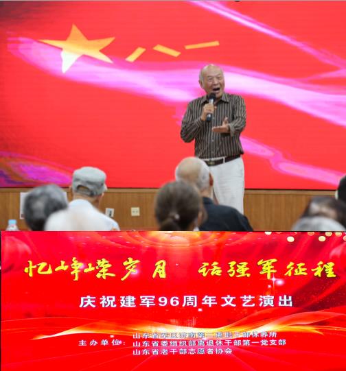 2023年7月31日,为庆祝中国人民解放军建军96周年,展示中国军队的荣耀历史和优良传统,增进军民共建和谐发展,共同为实现强军梦贡献力量。山东省军区济南第二离职干部休养所与山东省委组织部离退休干部第一党支部、山东省老干部志愿者协会联合举办“忆峥嵘岁月 话强军征程”文艺演出。