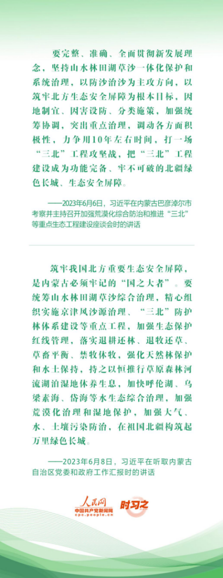 针对“三北”地区的林草植被种植工作,习近平指出,要科学选择植被恢复模式,合理配置林草植被类型和密度,坚持乔灌草相结合,营造防风固沙林网、林带及防风固沙沙漠锁边林草带等。