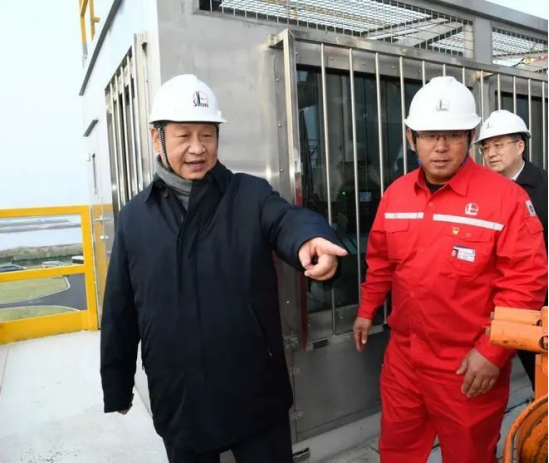 在山东东营的胜利油田,总书记沿着铁梯登上10多米高的钻井平台,察看设备运行情况,走进司钻室同正在作业的石油工人亲切交流。他鼓励大家“再创佳绩、再立新功”。