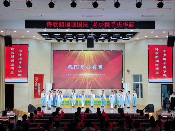 为庆祝中华人民共和国成立74周年,激发“五老”和青少年爱国之情、营造爱国爱党的浓厚氛围,9月28日上午,由泰安新泰市关工委、市委老干部局、市教育和体育局主办,市银河小学承办的“诗歌朗诵迎国庆,老少携手庆华诞”诗词朗诵会成功举行,市委常委、组织部部长、统战部部长贾朋,市关工委常务副主任王相玲,副主任王立明、安原、赵连军、田军,市教体局党组副书记、副局长赵秀珍及银河社区负责同志与市银河小学200余名师生共同观看朗诵会。