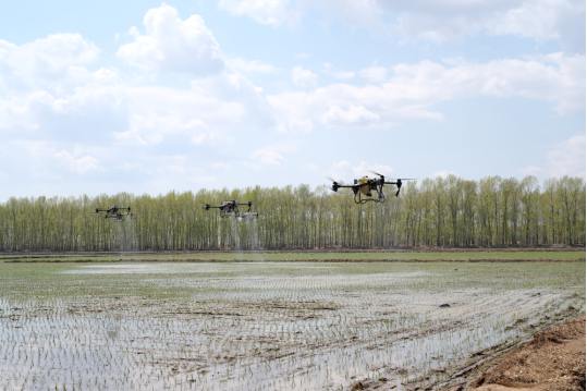2023年5月,北大荒集团军川农场有限公司正使用植保无人机对刚刚插秧的地块喷施液态返青肥。新华社记者黄腾 摄