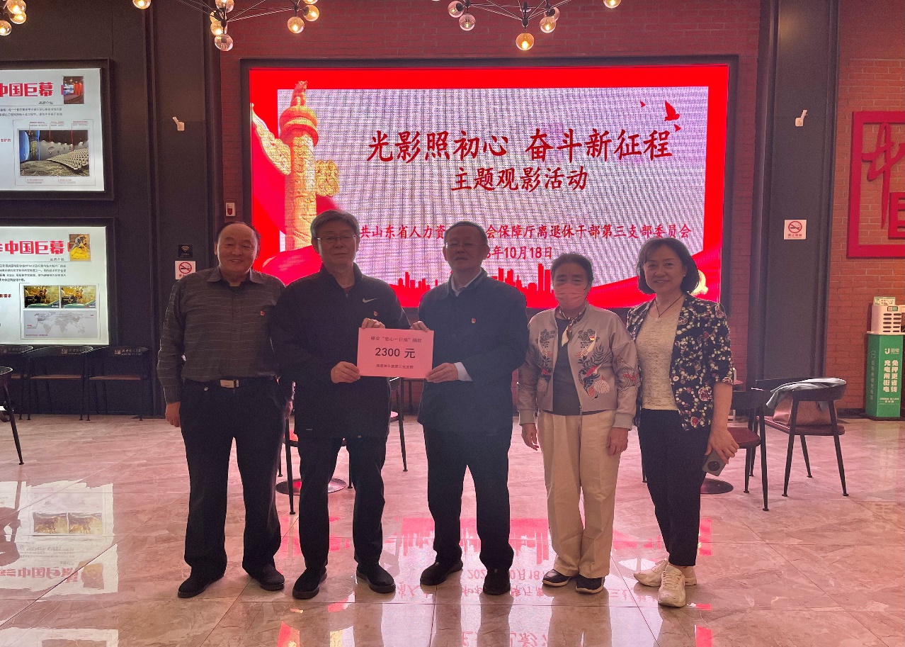 观影前,举行了“慈心一日捐”移交仪式,三支部班子成员代表支部全体党员向厅离退休干部处移交所捐款项。