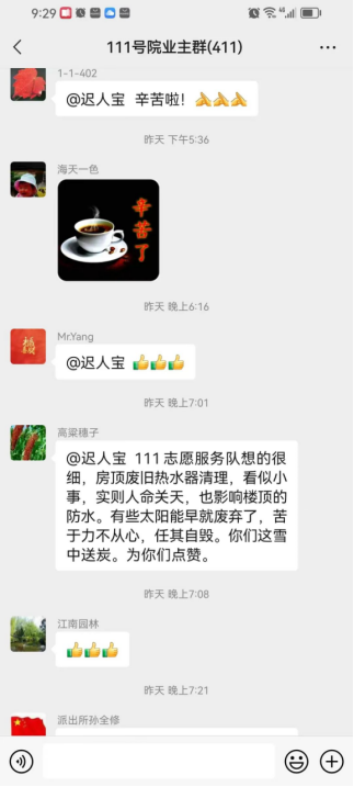 “111志愿服务队”是楼院自治的主要力量,他们退而不休,也是为社区治理发挥余热。今年秋季,大风天气频繁,为杜绝废旧太阳能板被大风刮下来的危险发生,队长迟人宝在楼院微信群中提醒各位居民需要提前认领楼顶废弃太阳能设施,服务队也会进行义务清理打扫。同时,随着天气转凉,他还建议居民拔掉空调插头,以防电池耗电或生锈,此举也得到了大家的一致好评。