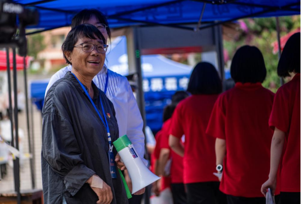 2023年高考首日,云南丽江华坪女子高中校长张桂梅在考点外看着学生们进场待考(2023年6月7日摄)。新华社记者 江文耀 摄