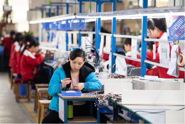 在湖南省汨罗市神鼎山镇丰仓村的“巾帼车间”,工人在生产数据线(2023年3月7日摄)。新华社记者 陈思汗 摄