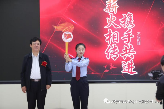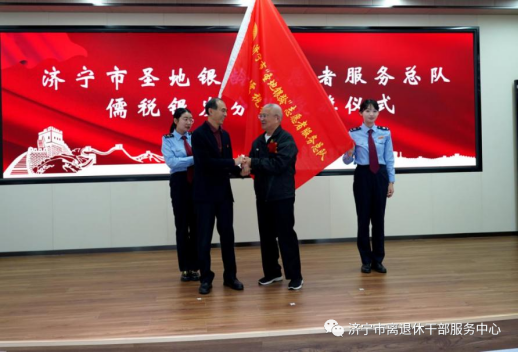 市离退休干部服务中心主任宋恩岱为市税务局退休干部组建的圣地银龄志愿者服务总队儒税银发分队颁授队旗。