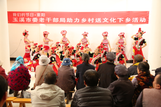 祝福祖国奏响“感恩曲”。在乡村振兴联系点澄江市养白牛社区、玉溪聂耳文化广场、玉溪青花街广场等群众活动集中的地方,开展了三场“感恩祖国·金秋送福”老年节文艺展演,来自市老年大学的学员和市老干中心文艺团体表演了快板《党颂》、大合唱《祖国不会忘记》,歌舞《扇花飞扬颂祖国》、手语舞《中华孝道》、舞蹈《快乐哈尼》、花灯《春到茶山》等群众喜闻乐见的文艺节目,展现了“夕阳红”老有所为、老有所乐的动人风采,“文艺盛宴”博得群众阵阵喝彩,营造出感恩祖国、歌颂新时代的浓厚氛围。