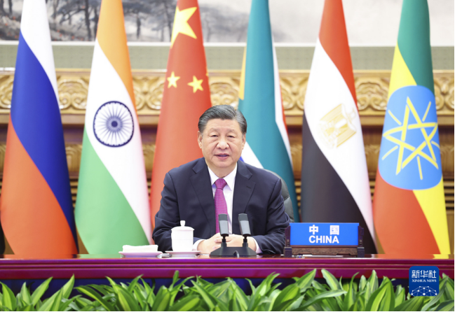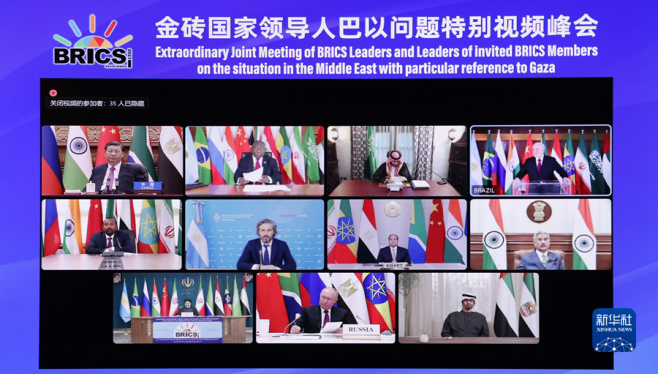 习近平强调,金砖合作机制是新兴市场国家和发展中国家加强团结合作、维护共同利益的重要平台。今天,我们就巴以问题协调立场、采取行动,为扩员后的“大金砖合作”开了个好头。中方愿同其他成员一道,开创金砖合作新时代。