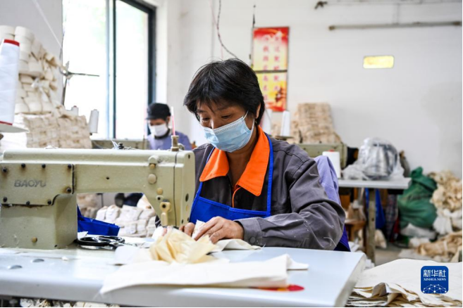 2023年11月30日,在贵港市港北区一家就业帮扶车间,当地群众在加工劳保用品。新华社记者 曹祎铭 摄