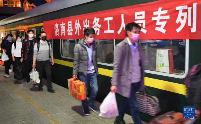 2020年2月24日,陕西省商洛市洛南县951名务工人员乘坐西安至杭州的务工专列,赴长三角地区工作。新华社记者 陶明 摄