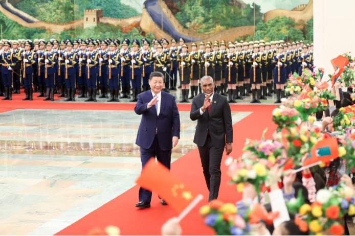 1月10日下午,国家主席习近平在北京人民大会堂同来华进行国事访问的马尔代夫总统穆伊兹举行会谈。这是会谈前,习近平在人民大会堂北大厅为穆伊兹举行欢迎仪式。