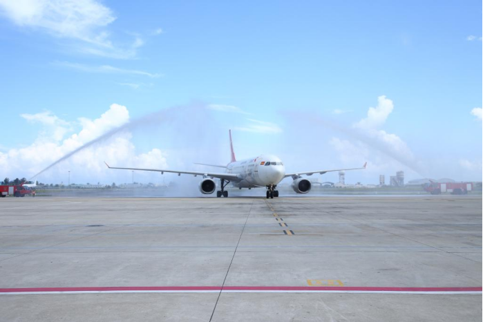2023年1月18日,中国首都航空JD455航班在马尔代夫马累维拉纳国际机场接受水门礼。
