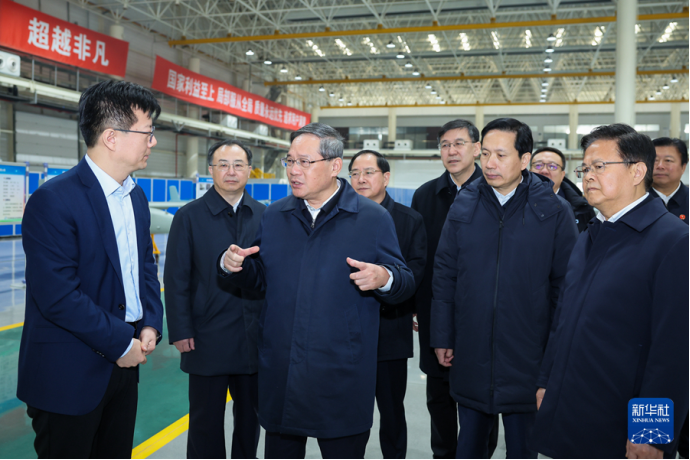 1月29日至30日,中共中央政治局常委、国务院总理李强在陕西调研。这是1月30日,李强在西安爱生技术集团无人机产业化示范基地察看无人机成品及配套系统展示,详细询问性能、实际应用等情况。新华社记者 刘彬 摄