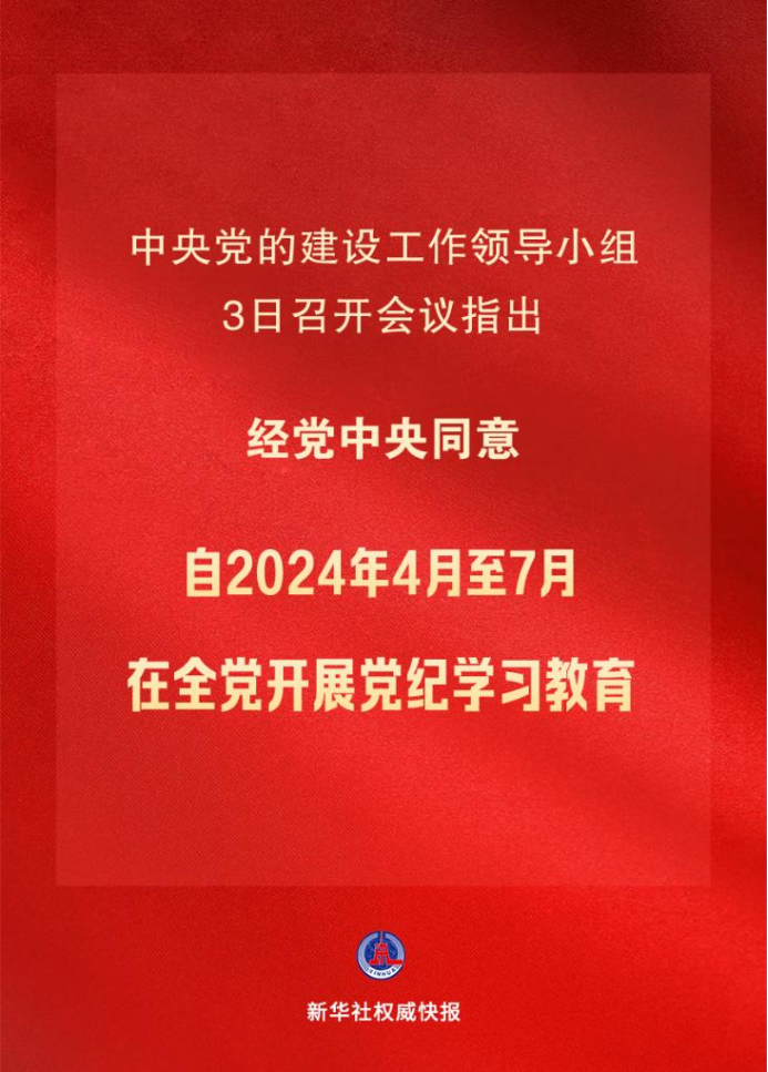 新华社权威快报丨党纪学习教育自2024年4月至7月在全党开展