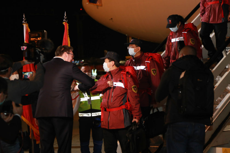 △2020年3月21日,在塞尔维亚贝尔格莱德,前来迎接的武契奇总统与中国援助塞尔维亚抗疫医疗专家组成员“碰肘”致意。