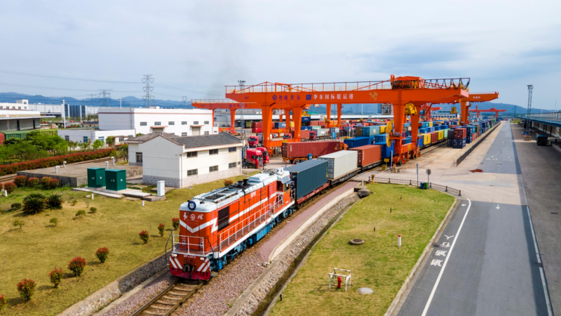 △2024年4月1日,浙江省金华华东国际联运港,一列中欧班列装载110个标箱日用百货、电动工具、机械装备等货物从铁路金华南货场启程驶往匈牙利布达佩斯。