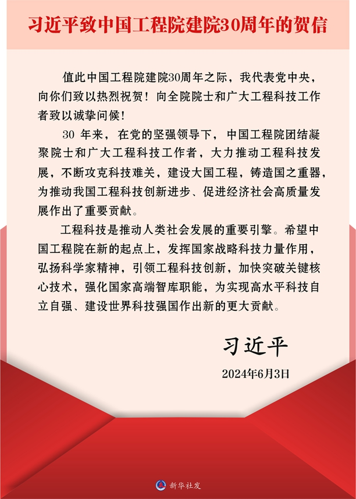 新华社北京6月3日电 在中国工程院建院30周年之际,中共中央总书记、国家主席、中央军委主席习近平发来贺信,代表党中央致以热烈祝贺,向全院院士和广大工程科技工作者致以诚挚问候。