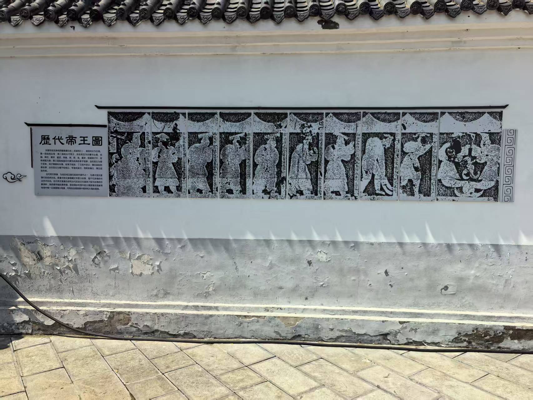 顶着骄阳,迎面走向新装饰的博物馆大门。未进门就看见右侧的墙上镶嵌着两幅活龙活现的拓片:一幅是《历代帝王图》,描绘了伏羲与女娲、祝融、神农、黄帝、颛顼、帝喾、尧、舜、禹、夏桀等帝王的各异姿态,珍贵之处在于每个人物画像都用隶书榜题名字;一幅是《孔子见老子》,描绘了孔子向老子问礼的历史故事,也用隶书榜题“孔子也”、“老子也”,展现了儒家先师孔子和道教始祖老子互敬互学的历史画卷。这两幅珍贵拓片一下子把我们带进了华夏文明的宝库和视野之中。门左侧矗立着国务院于1961年批准的全国重点文物保护单位“武氏墓群石刻”的长方形石碑。门两旁还挂有“北京大学汉画研究教学实习基地”、“山东省社会科学普及教育基地”、“济宁(嘉祥)干部政德教育基地”的牌匾。瞬间,使我们看到了“武氏祠”的现代价值和作用,增强了对其崇敬之情。