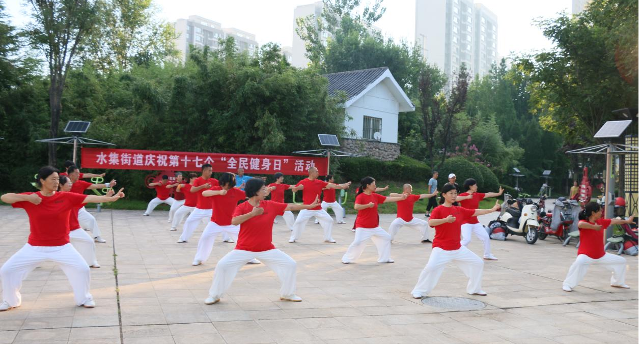 水集街道地处莱西市政府驻地,主城区人口密集,居住的是所谓的“城里人”。北部社区是农村,有原来的韶存庄乡合并而来的。为使更多人了解全民健身、迈入全民健身,融健身与健康于一身。在第十七个“全民健身日”展演活动中,水集街道老年体协在主城区组织城区内的太极队、舞蹈队、无极球队等,展演了健身穴位操、健身气功八段锦、导引养生功十二法、24式太极拳、杨式103式太极拳、太极扇、太极刀、太极剑、无极球、广场舞等活动。在北部社区组织了秧歌队、舞蹈队等,展演了莱西大秧歌和广场舞等,活动丰富多彩,形式多样,面上开花。进一步掀起了“全民健身、你我同行”“我运动、我快乐、我健康”的热潮。88岁的市民张先生看到舞台上的展演,在下面也跟着比划了起来,是那样的开心和快乐。