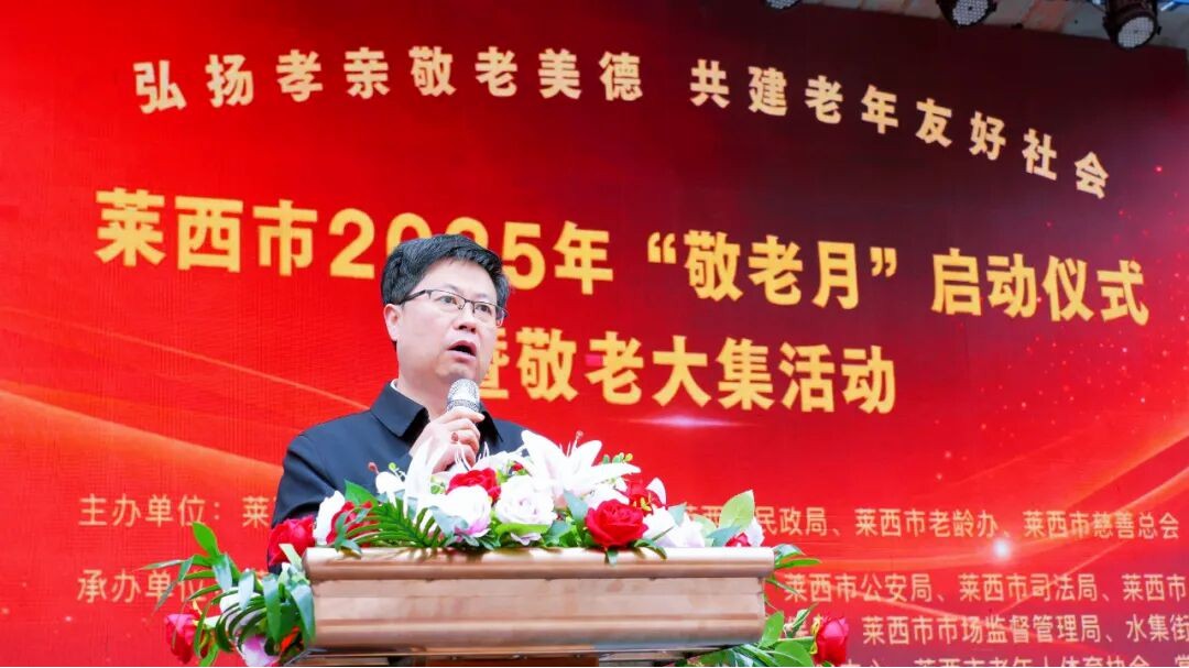 “敬老月”启动仪式在欢快的开场舞中拉开了帷幕。莱西市民政局主要负责同志在致辞中向全市老年人送上深深的问候,向银龄志愿者和养老一线的工作者表达深深敬意,向社会各界关心支持老龄事业人士表示感谢。并介绍了近年来莱西市老龄工作所做的努力和取得的成果,倡导全社会参与共同关心关注老龄事业,建设老年友好型社会,不断提升全市老年人幸福指数。