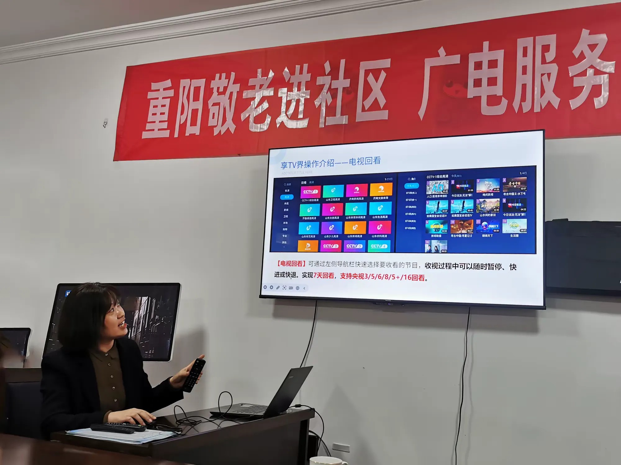 这次重阳敬老活动,重点围绕老同志们在电视收看、遥控器使用等方面经常遇到的问题,提供现场指导与便民服务,重在帮助老同志们切实解决在电视收看中遇到的实际困难,提升其居家文化养老生活品质,更好地满足大家的精神文化需求。省广播电视局机关党委王桂娟处长和中国广电山东网络有限公司济南市市中区分公司市场部主任张爱芳分别介绍了广播电视便民服务政策,解答收视问题;现场演示和指导智能遥控器、便捷视听设备的使用;山东传媒职业学院书匀老师(原山东广播电视台著名主持人)作了生动感人的防范通信网络诈骗宣传:增强老同志识骗、防骗意识,守护财产安全;与此同步提供了血压测量、磨菜刀等便民暖心服务。